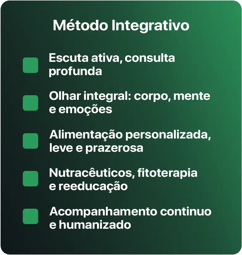 A Nutrição Integrativa que aplicamos une ciência, escuta ativa e utiliza as ferramentas mais modernas, como o mapeamento epigenético e a nutrição ortomolecular, aliadas à nutrição funcional, fitoterapia e à naturopatia. Nada é genérico. Nada é raso. Você não será resumida a um relato de 15 minutos de consulta. Seu problema não será tratado apenas com diminuição de sintomas e sim com um olhar aonde solucione a causa raiz.